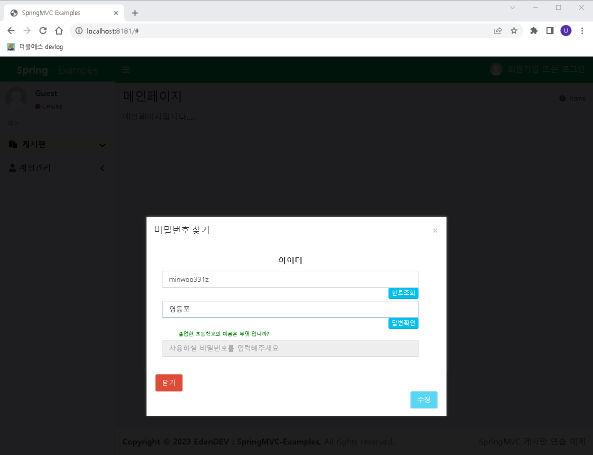 이렇게 아이디 찾기 기능과 비밀번호 찾기 기능을 만들어 보았습니다.