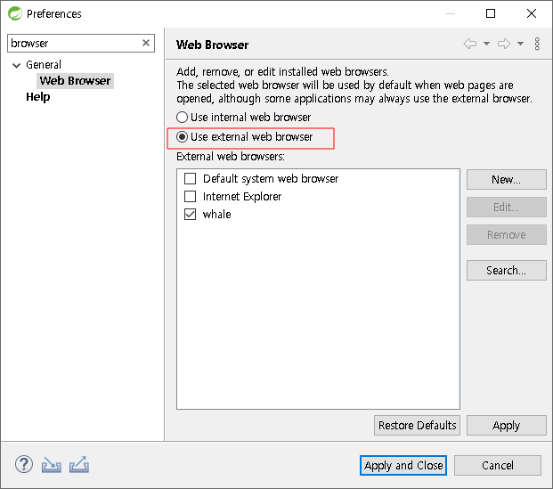 Preferences에서 browser로 검색하시고 변경하시면 됩니다.