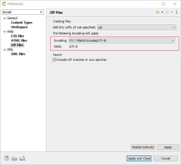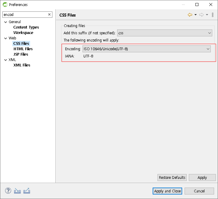 Workspace, HTML Files, CSS Files, JSP Files를 검색해 적용해 주시기 바랍니다.