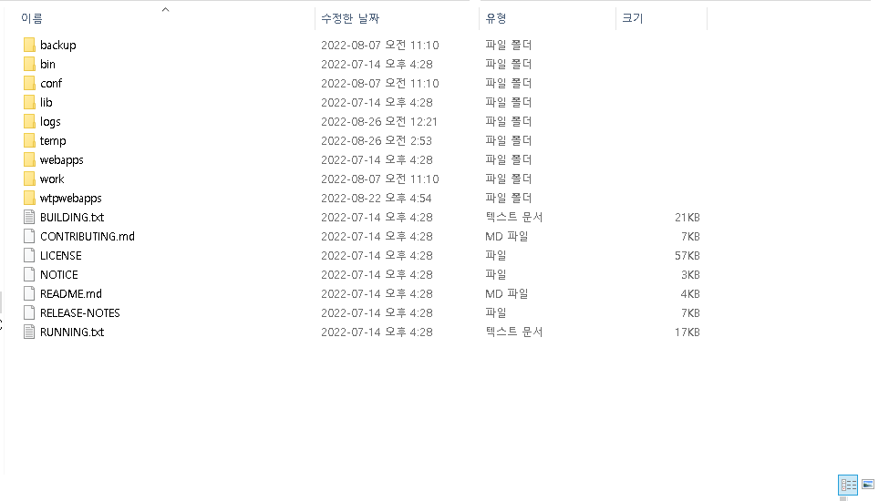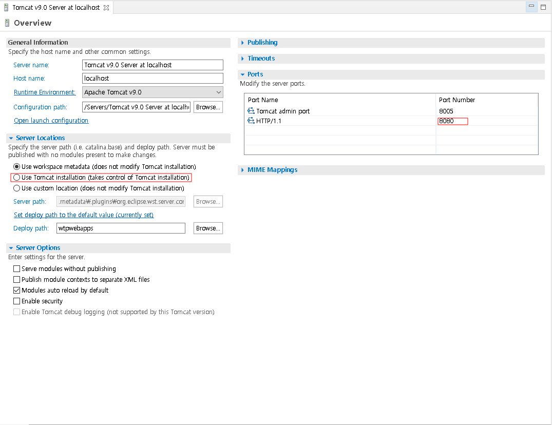 그림 06. Tomcat v9.0 Server at localhost 더블 클릭하셔서 설정 페이지를 열어주시고 HTTP/1.1 Port 부분을 다른 숫자로 변경 해주시고 Use Tomcat installation (takes control of Tomcat installation) 체크 후 저장 해줍니다