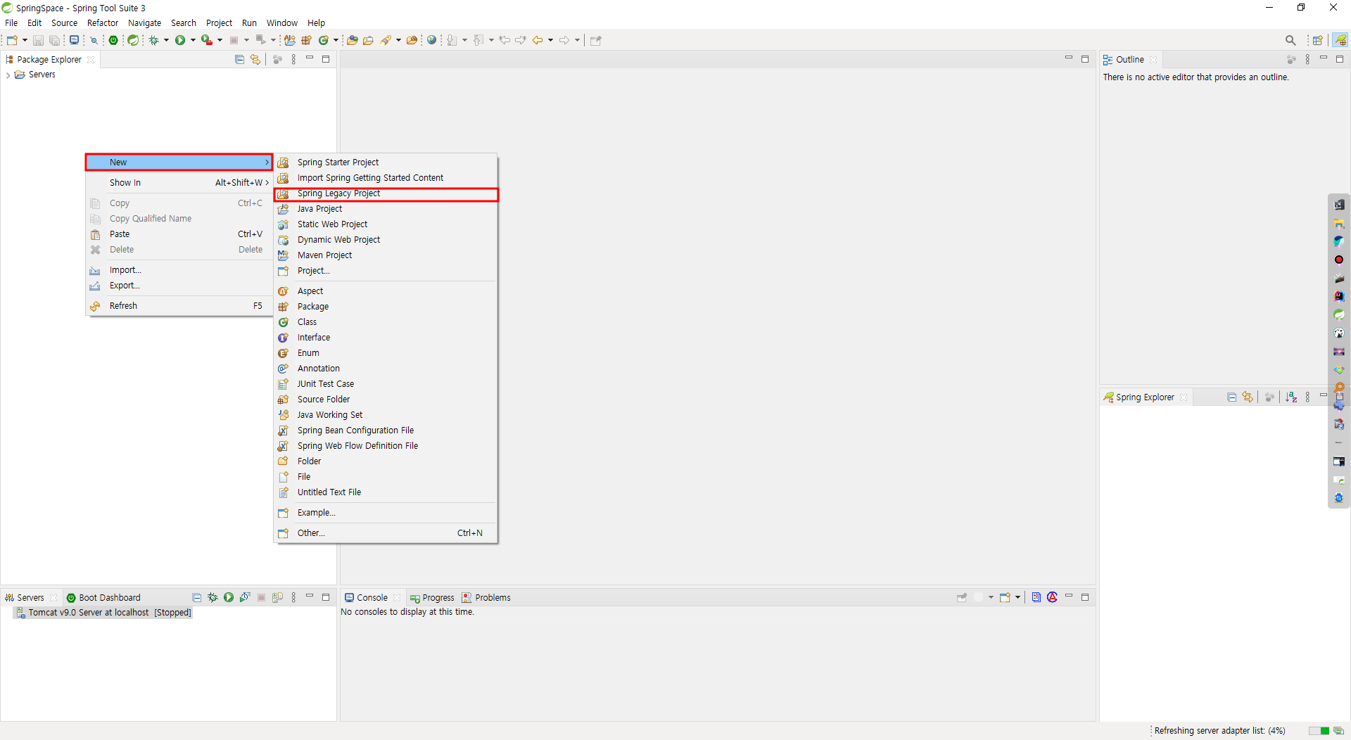 빈 공간에서 마우스 우클릭 하신 후에 New -> Spring Legary Project 선택 합니다.